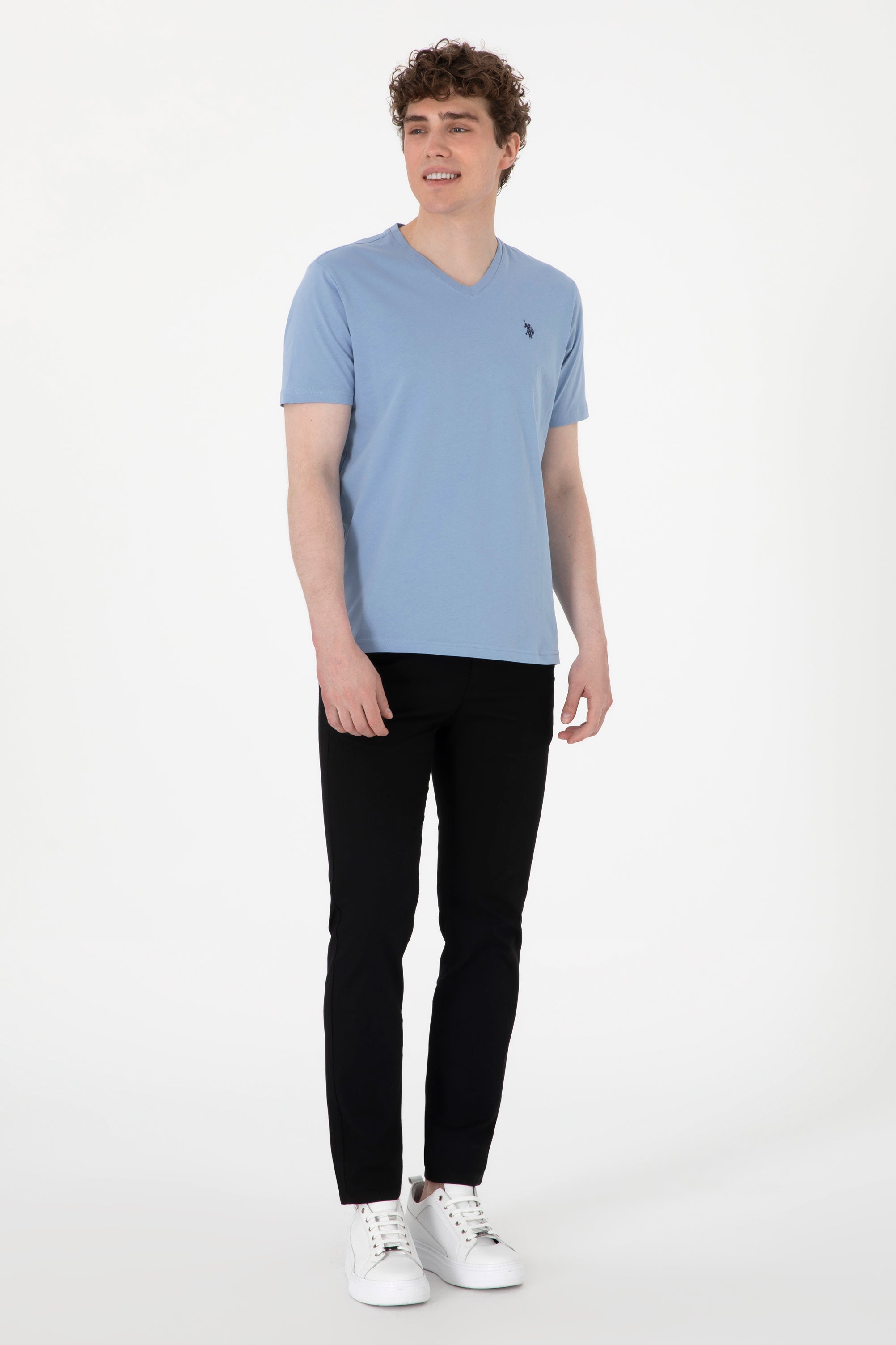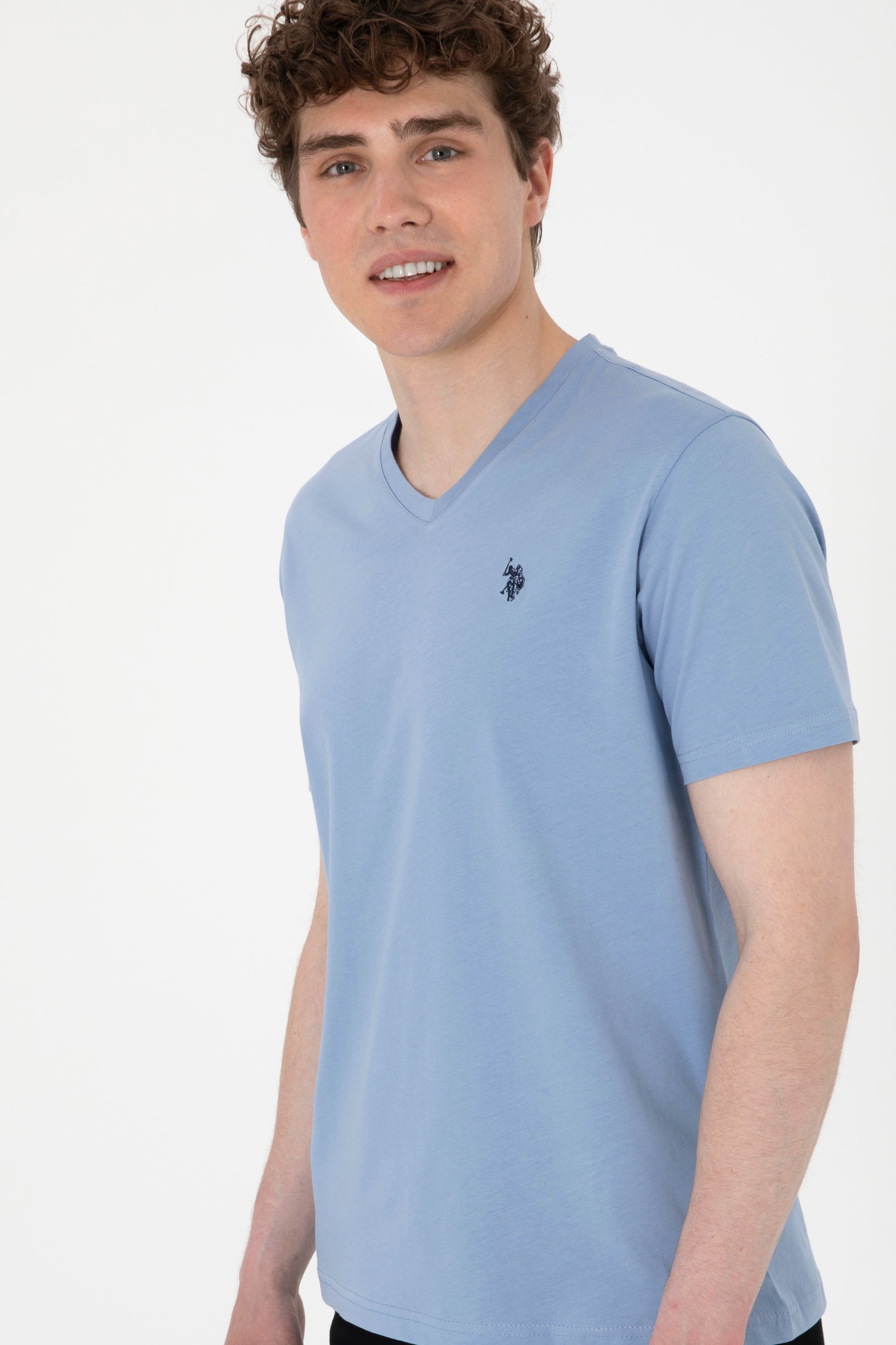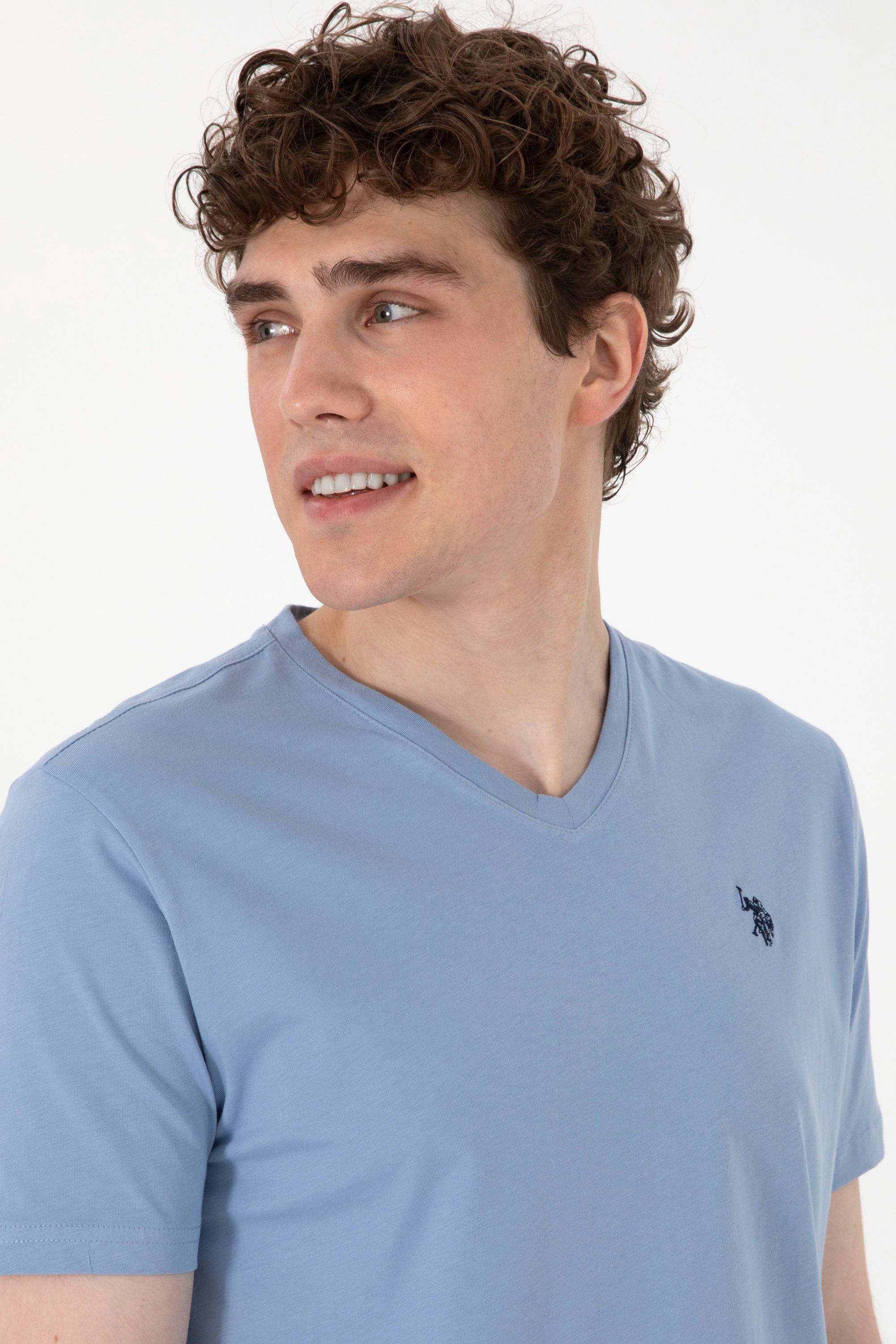 Tricou Barbat Albastru Cu Guler In V Si Logo Brodat