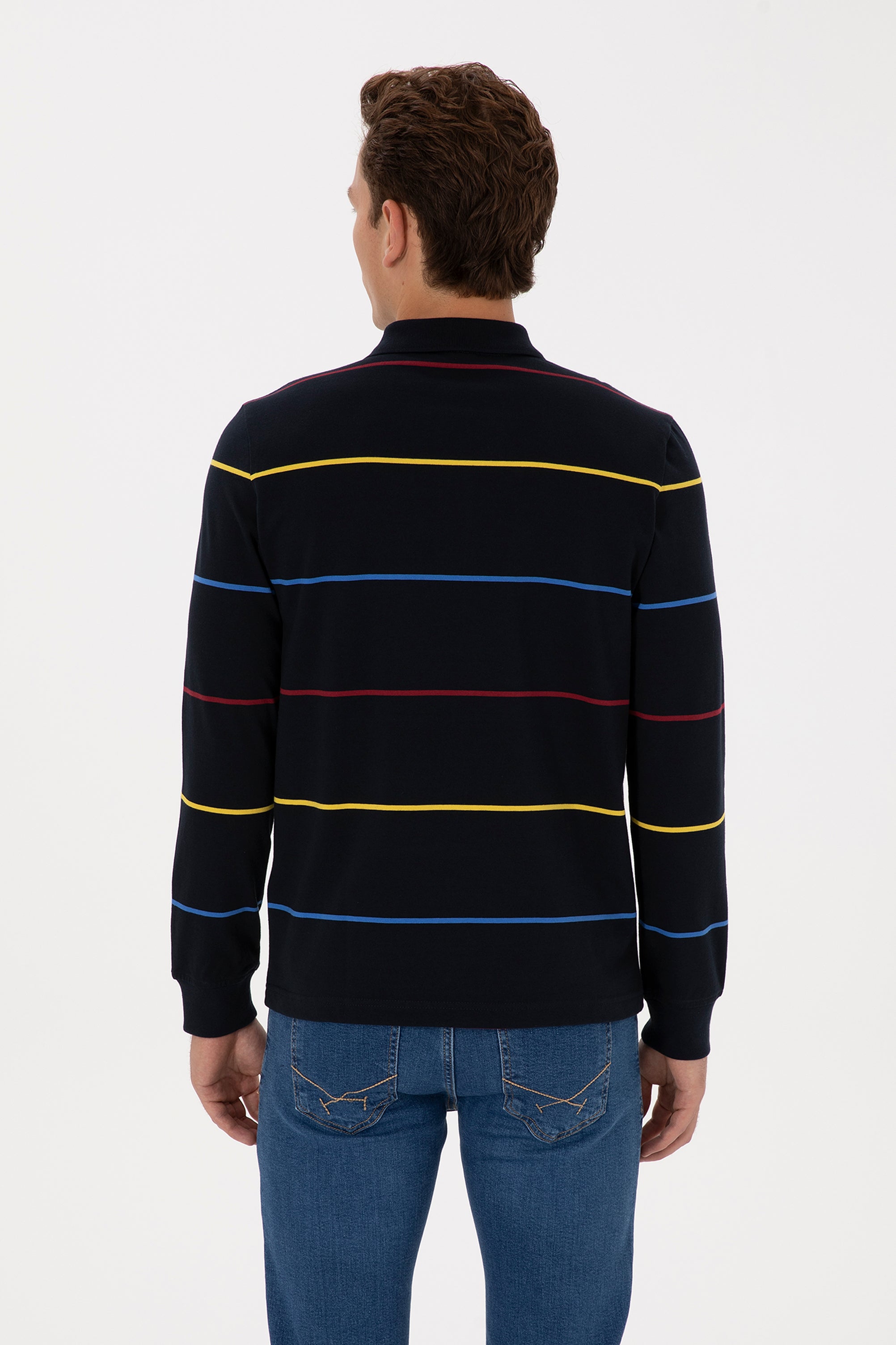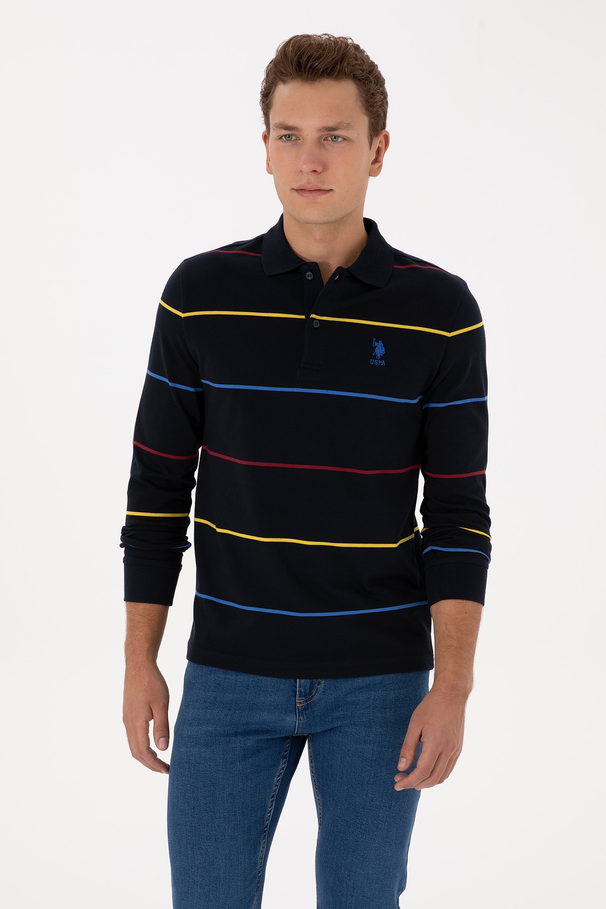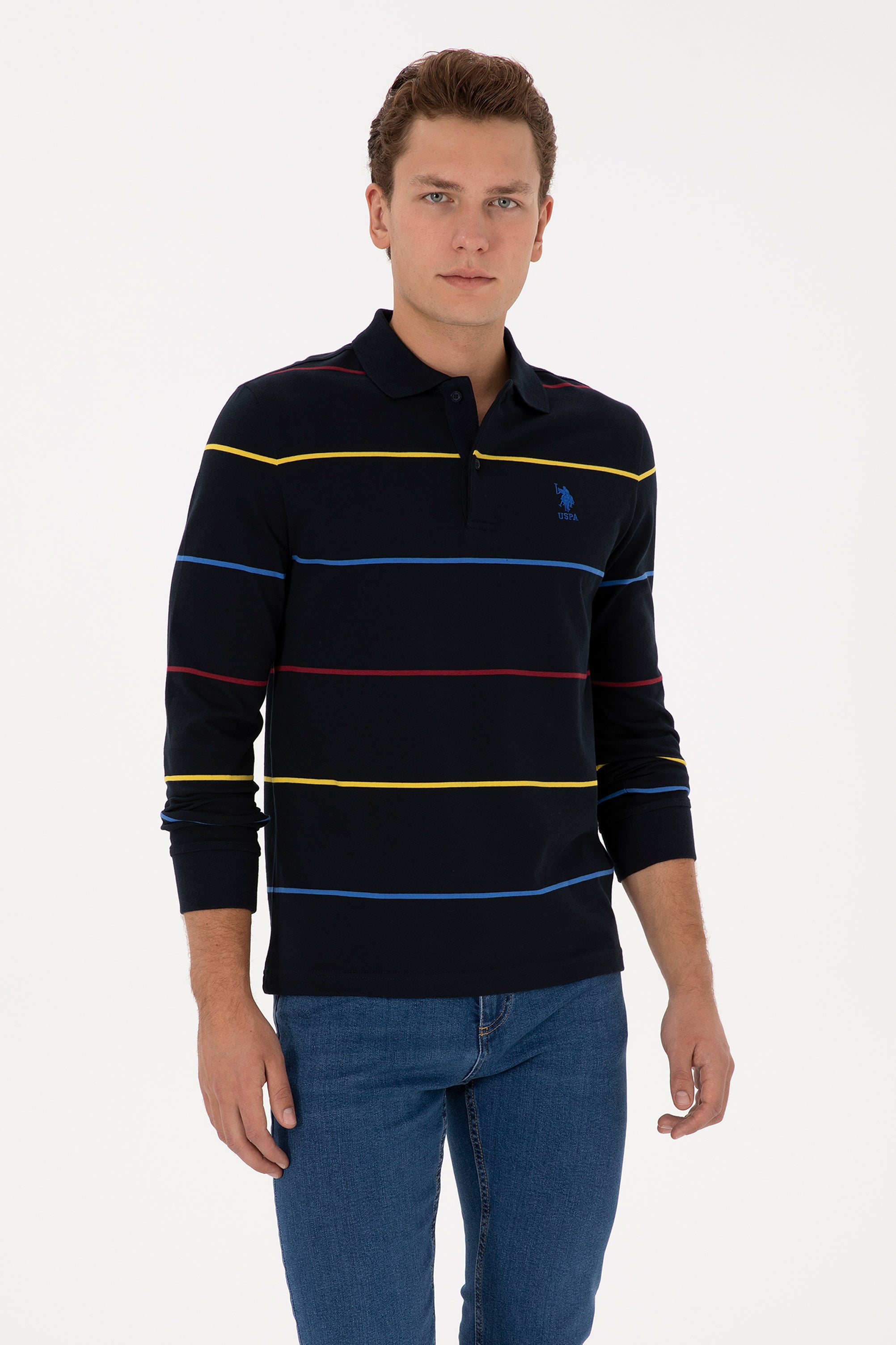 Bluza Polo Barbat Pe Bleumarin Cu Dungi Orizontale Multicolore